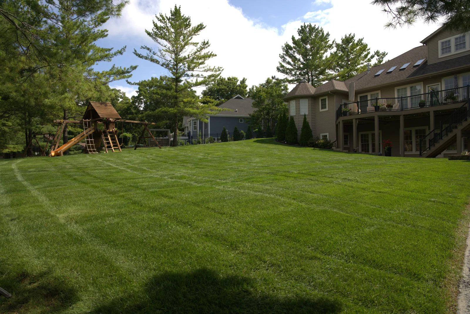 Green Acres freshly mowed residential lawn with professional striping pattern and manicured shrubs