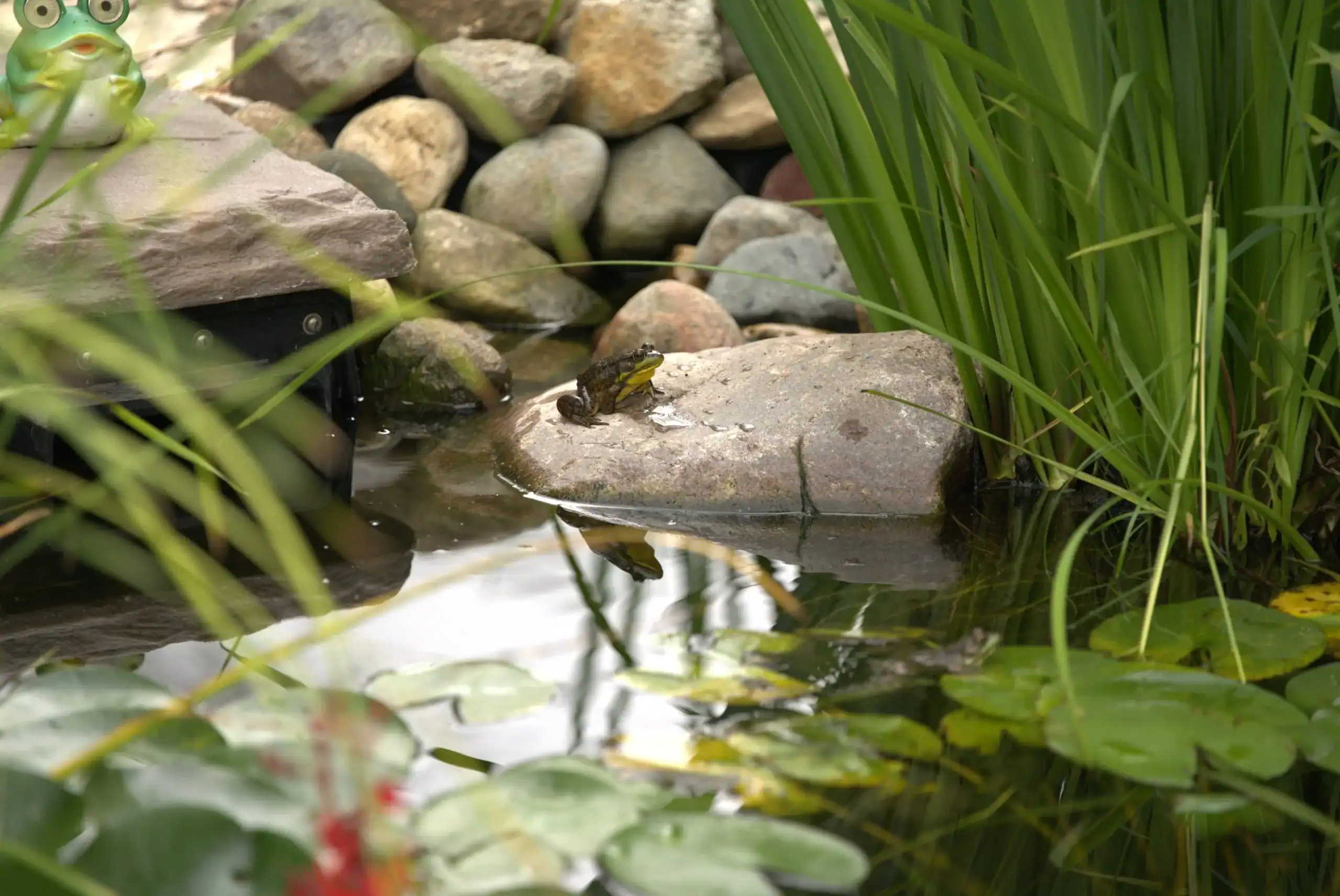 Green Acres decorative pond installation with stone edging, water plants, and frog statue ornament